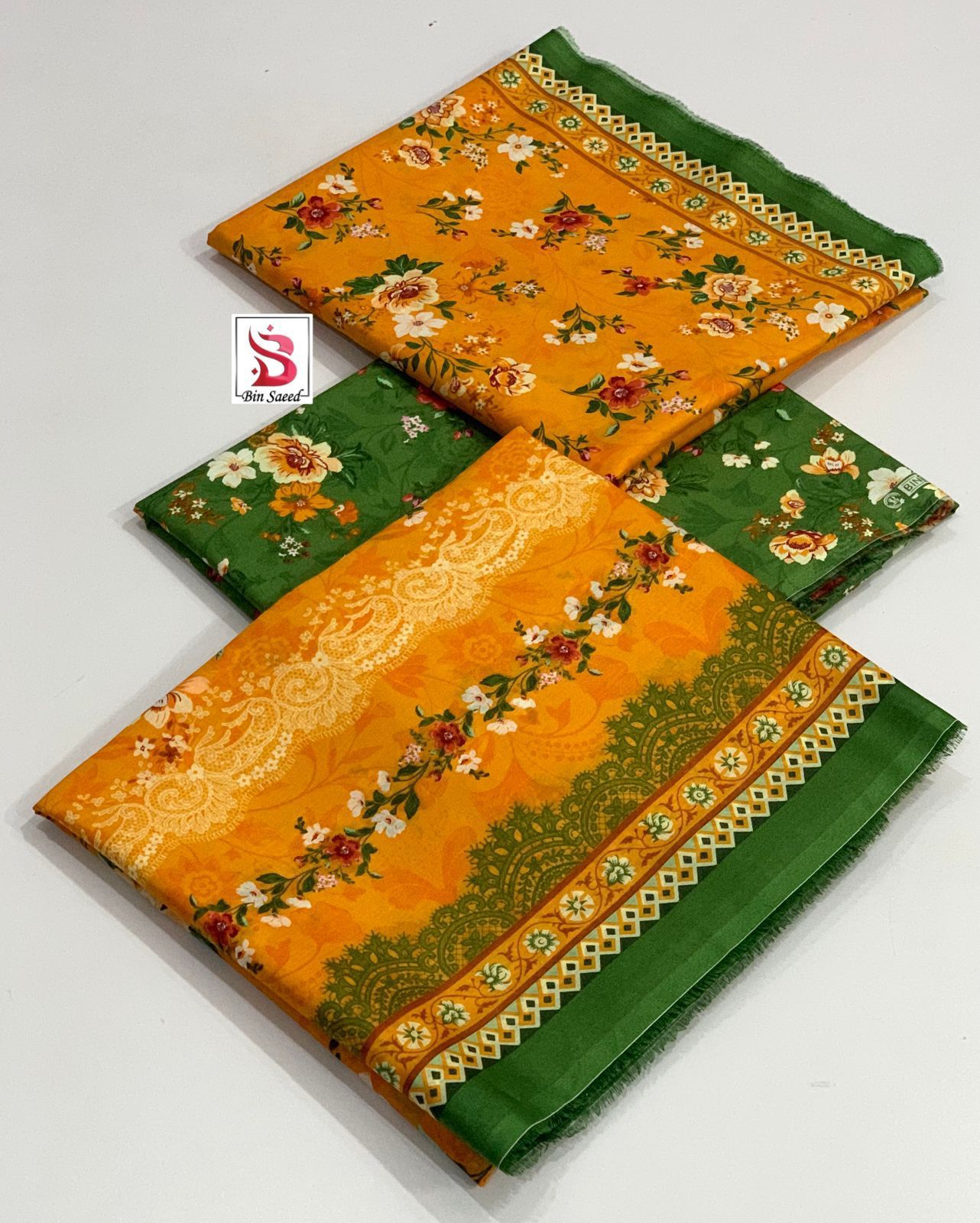 Fabric Lawn – Bin Saeed – Printed 3pc Collection- Color – Green&Orange