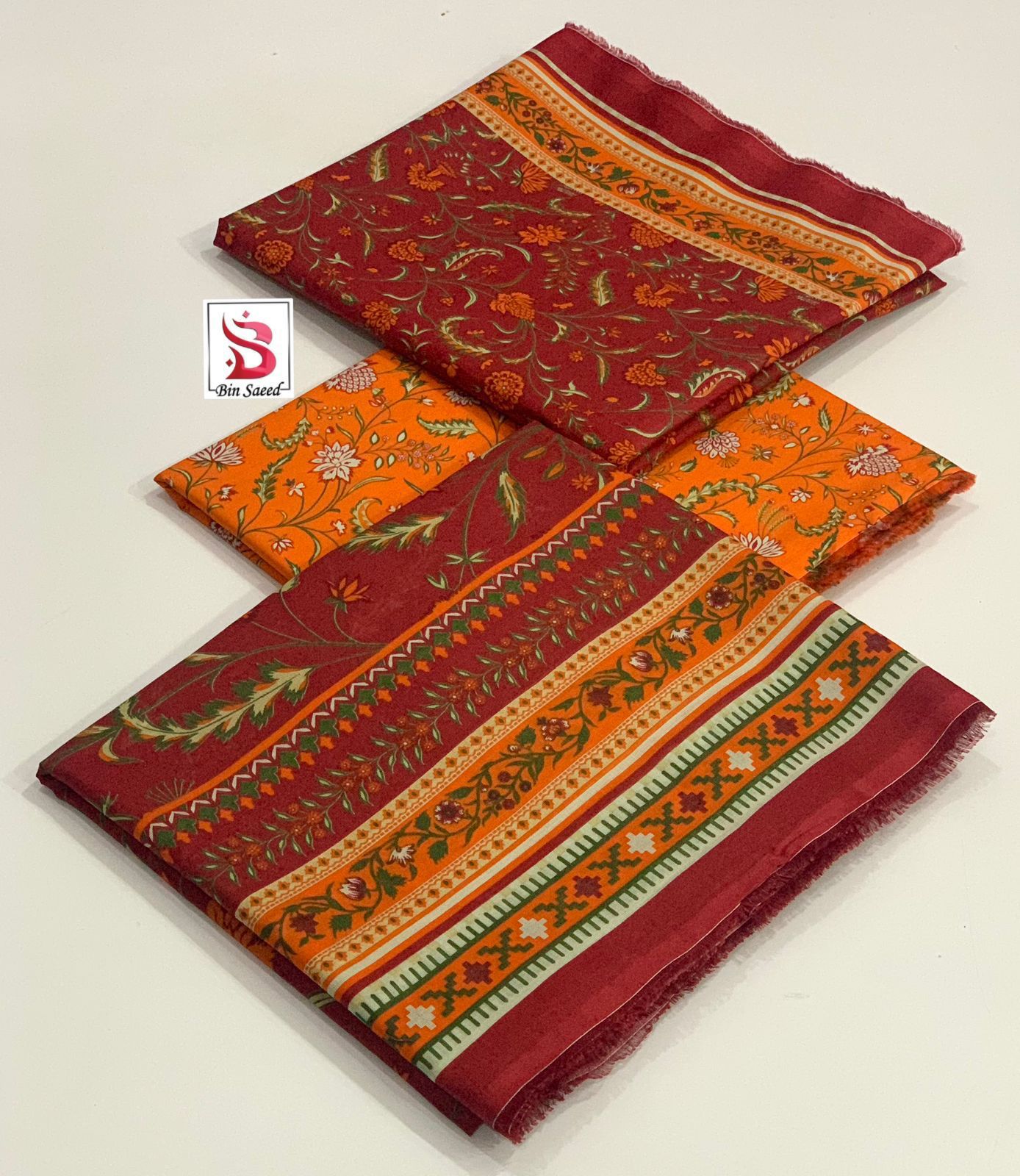 *Bin Saeed Original *Printed 3pc Collection* *Fabric Lawn* *Printed Lawn Shirt* *Printed Voil lawn Duppata* *Dyed lawn trouser* *Stuff N Colors *Garenty* *Beautiful Colors Nd* *Designs* *Booked Your Order Now Fast*