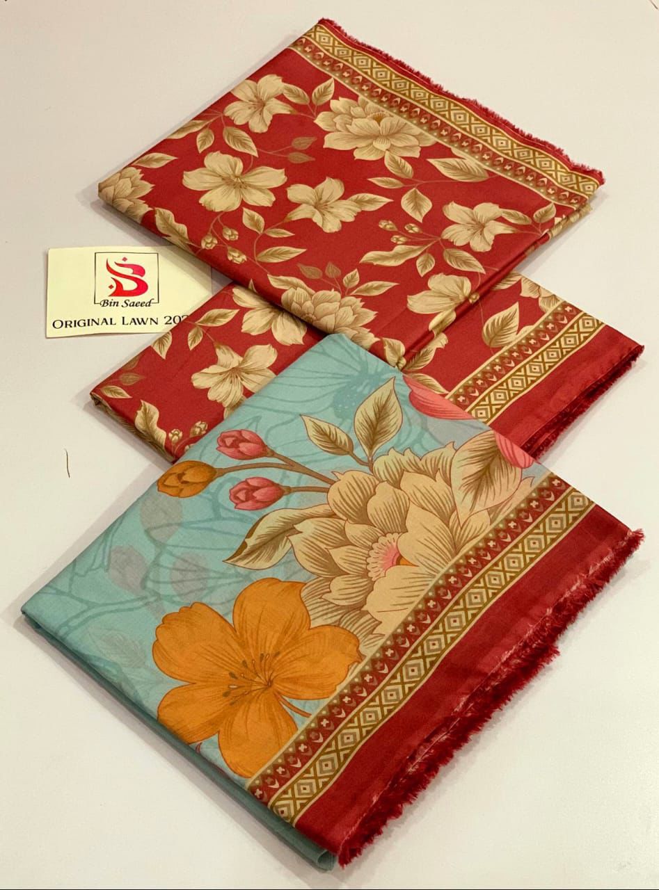 *Bin Saeed Original *Printed 3pc Collection* *Fabric Lawn* *Printed Lawn Shirt* *Printed Voil lawn Duppata* *Dyed lawn trouser* *Stuff N Colors *Garenty* *Beautiful Colors Nd* *Designs* *Booked Your Order Now Fast*