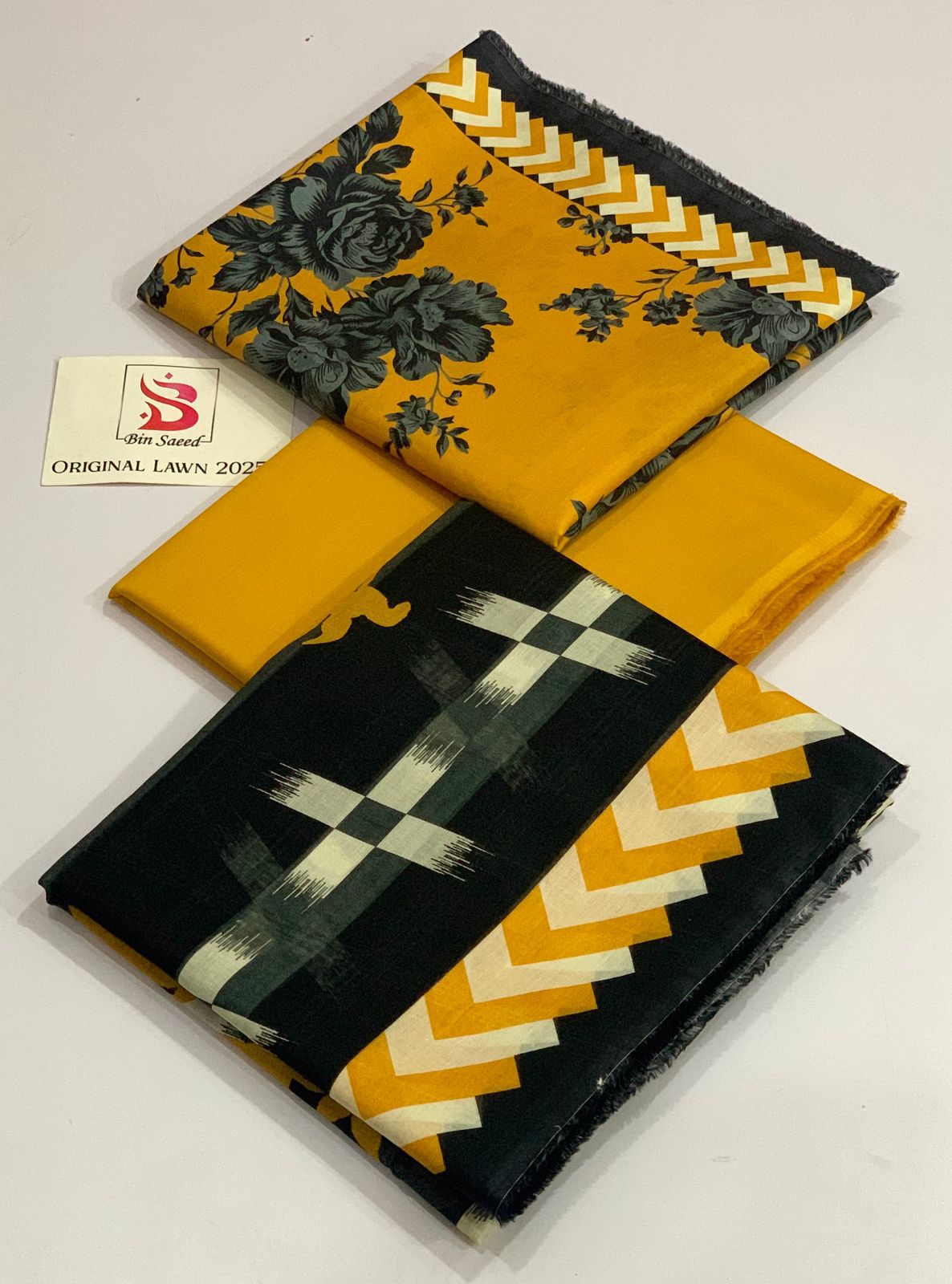 Fabric Lawn – Bin Saeed – Printed 3pc Collection- Color – Mustard Yellow