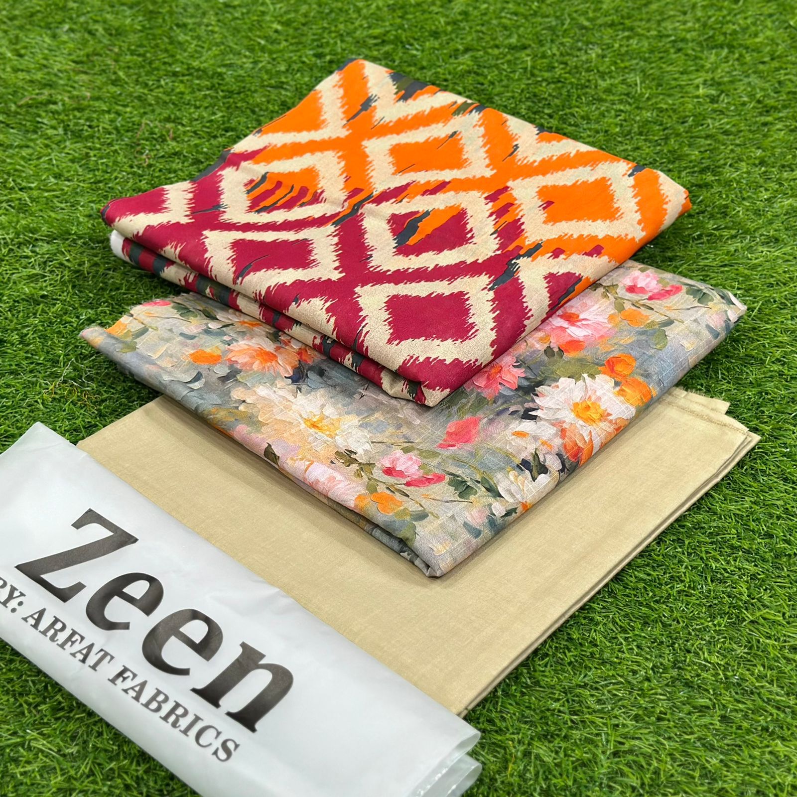 Fabric Lawn – Bin Saeed – Printed 3pc Collection- Color – Green&Orange